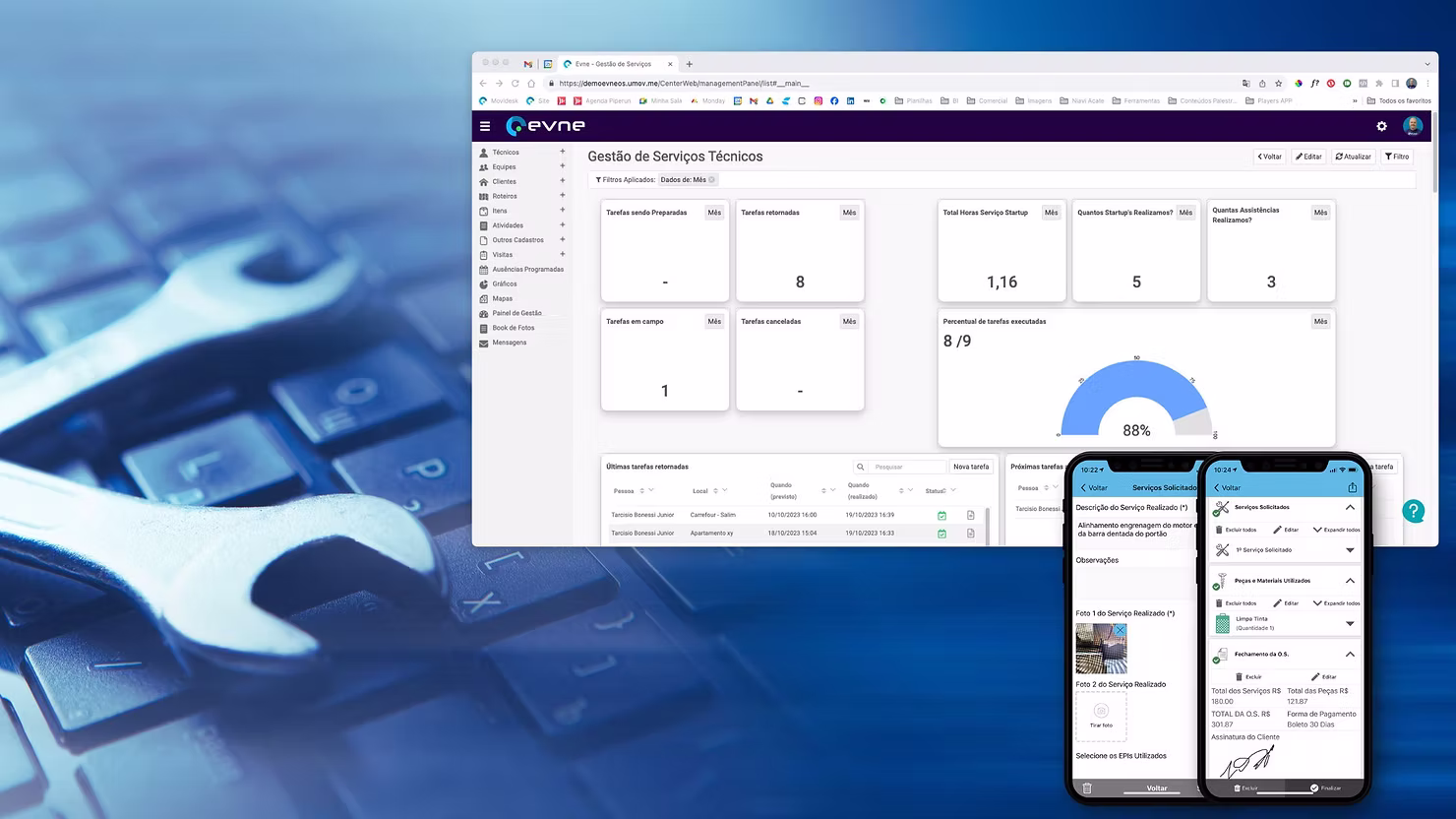 O aplicativo de serviço desenvolvido pela Evne Tecnologia é uma ferramenta completa que revoluciona a assistência técnica. Suas funcionalidades são projetadas para otimizar cada aspecto do processo. Entre as funções acessórias, destacam-se o controle de jornada do técnico, registro de despesas em viagem e checklists para o controle do veículo e quilometragem.
