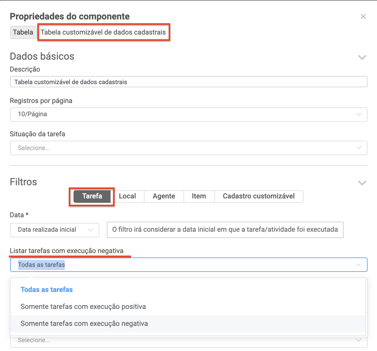 Maior flexibilidade na construção de componentes customizáveis, permitindo ao usuário indicar se quer visualizar somente tarefas com execução positiva ou negativa.